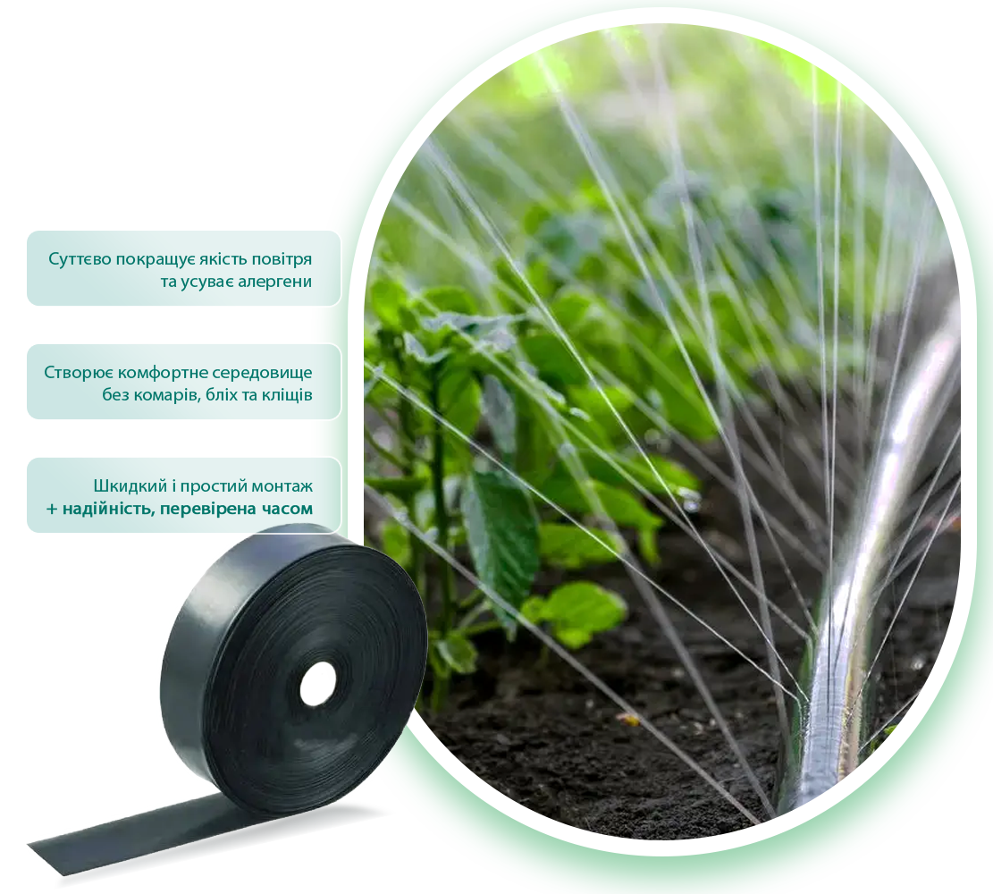 Завдяки тиску, мікро краплі води повністю випаровуються в повітря. Перебуваючи на терасі під таким туманом, ви не змокнете, а відчуватимете тільки приємну свіжу прохолоду. Дрібні краплі води не тільки охолоджують повітря, знижують його забрудненість, а ще й усувають сторонні запахи і відлякують настирливих комах.